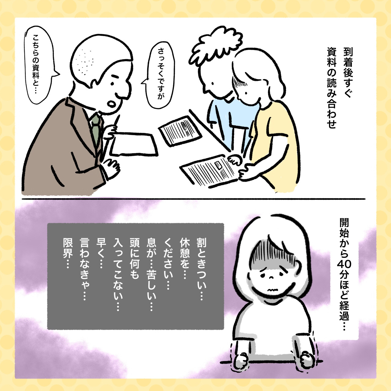 つわり中は、突然気分が悪くなってしまうことがありますよね。当時、しろぺんきさんは銀行での打ち合わせ中に苦しくなってしまったものの、なかなか言い出せずにいたそうです。