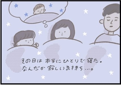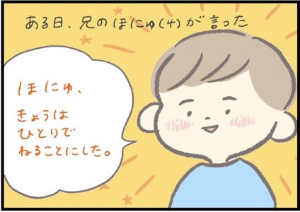 子どもたちが生まれてから、夜は同じ部屋で寝るスタイルのつぶみさん。子どもたちの寝顔をみるたびに幸せな気持ちが溢れていましたが、あるとき兄のほにゅくん(4歳)がひとりで寝ることに。息子の成長を感じつつも、毎日一緒にいられる今を大事にしようと改めて感じるのでした。