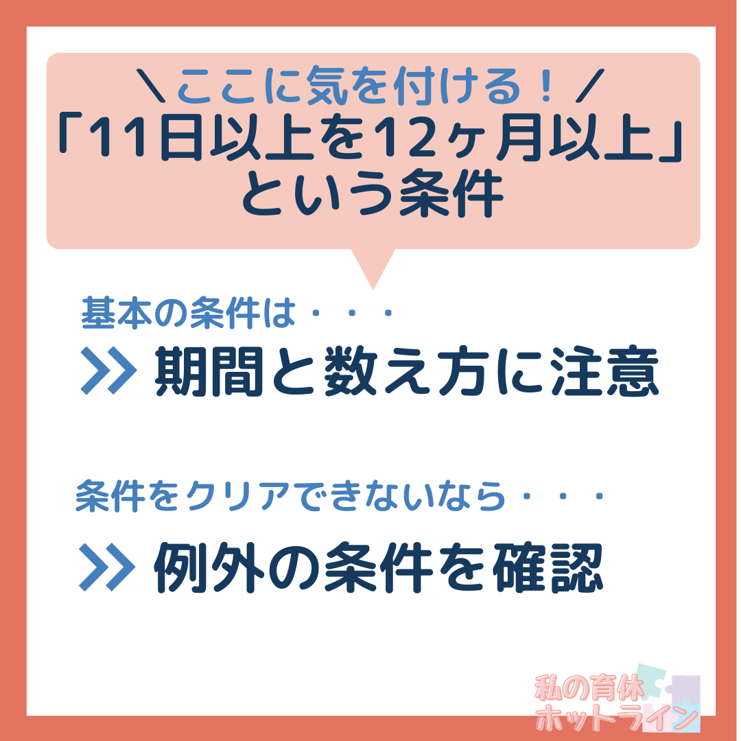 でも大丈夫です。細かい受給条件はたくさんありますが重要なポイントは1つだけ。それは「11日以上出勤を12ヶ月以上してること」です。