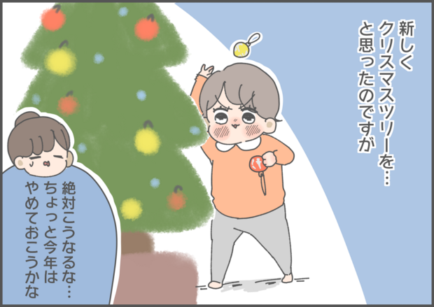 育児マンガ家おかめ(@omame_okame)さんの日常の出来事や奮闘をマンガでお届けします。今年ももうすぐクリスマスがやってきます。安全対策などのため、今年はクリスマスツリーを飾れないかなと悩んでいたおかめさん。そんなお悩みを解決してくれる、我が家にぴったりなツリーに街で出会ったようです…!
