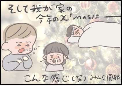 夜空を見上げてサンタさんにお願いごとをするほにゅくん(4歳)と何かを嬉しそうにママに伝えるねむちゃん(2歳)。ふたりがクリスマスを楽しみにしている様子が伝わってきますね。しかし、クリスマス目前に家族が次から次へと風邪をひき…!咳や鼻水、熱に苦しんだクリスマスになってしまいました。