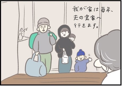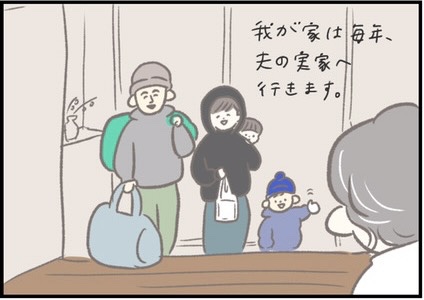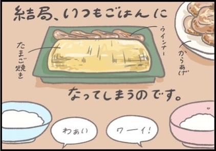 年末年始を義実家ですごしたつぶみさん一家。お義母さんのつくってくれた料理にママとパパが幸せを感じている一方で、反応がいまいちな子どもたち。結局、からあげやウインナー、たまご焼きなど「いつものごはん」の登場にテンションが上がるのでした。