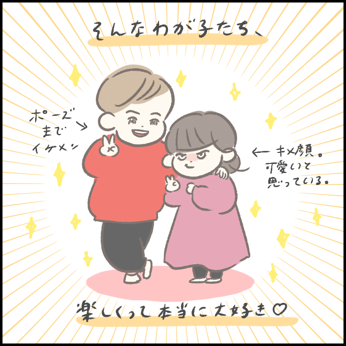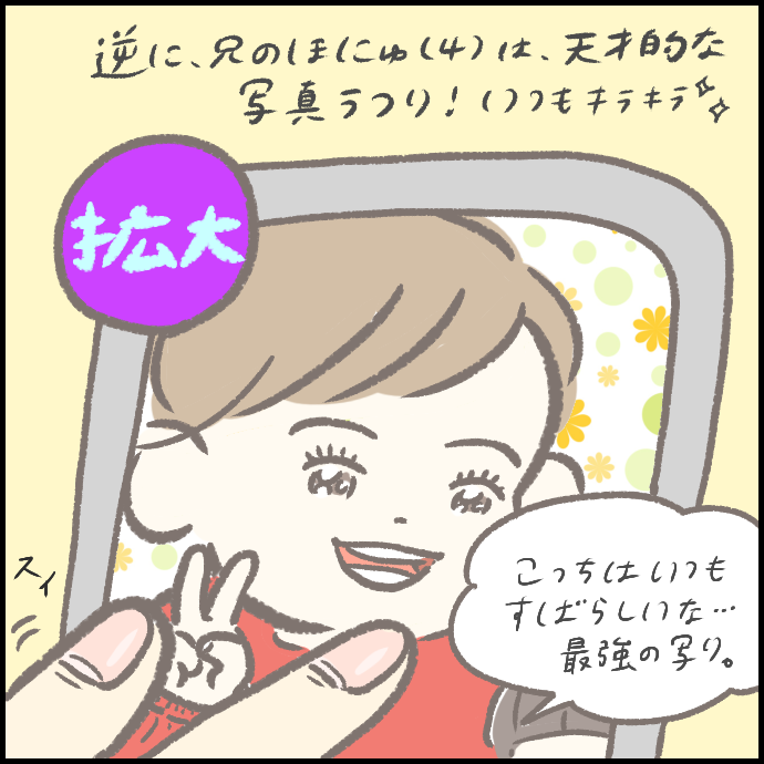 つぶみさんの「とるよー」のかけ声に、それぞれポーズを決めるねむちゃん(2歳)とほにゅくん(4歳)。ポーズも表情も天才的な兄と、オリジナルのお気に入りキメ顔を披露する妹との写真うつりの違いを楽しむつぶみさんなのでした。