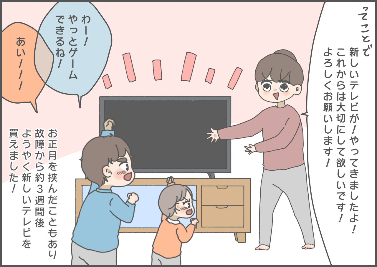 シンママのお財布がどうなることやらと一時心配でしたが、無事新しいテレビもゲットできました!加入している火災保険によって、家電や家具も対象になる場合も多いようですが、子どもが小さいうちはより心強い存在かもしれませんね…!