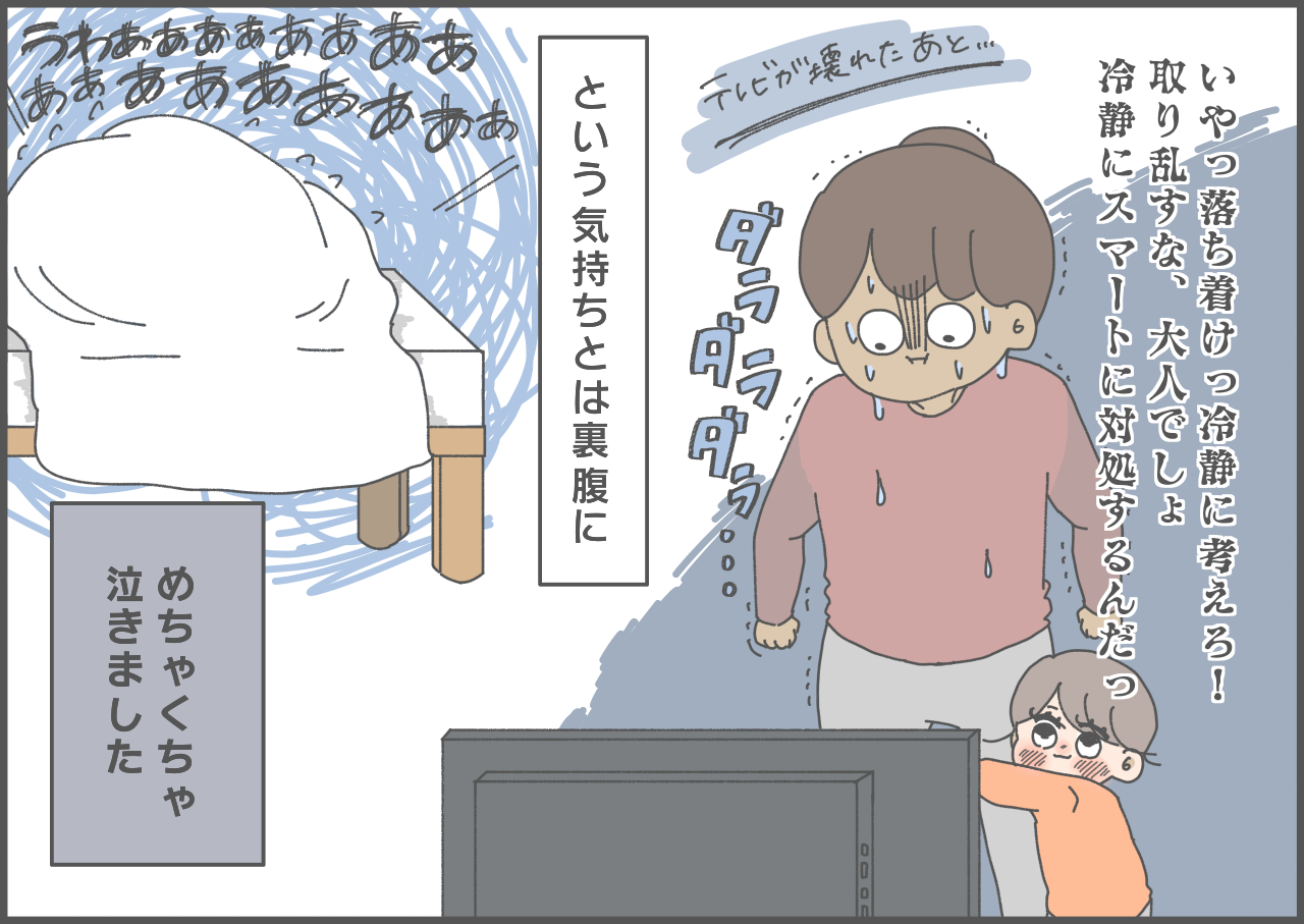 育児マンガ家おかめ(@omame_okame)さんの日常の出来事や奮闘をマンガでお届けします。買ってまもないテレビの画面が寝ている間に割れてしまったという悲劇に見舞われたおかめさん。無傷だった娘に安堵しながらも、驚きとショックが大きかった出来事でしたが、なんとその後の続報があるそうです。それはいったい…?