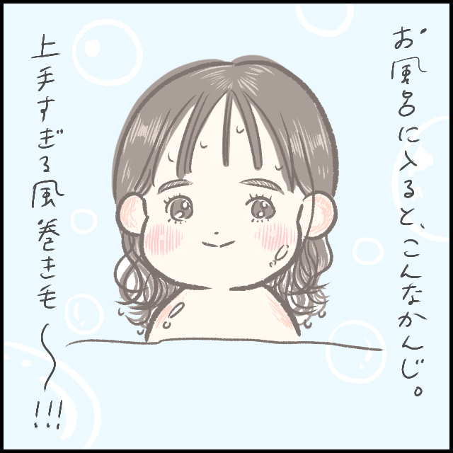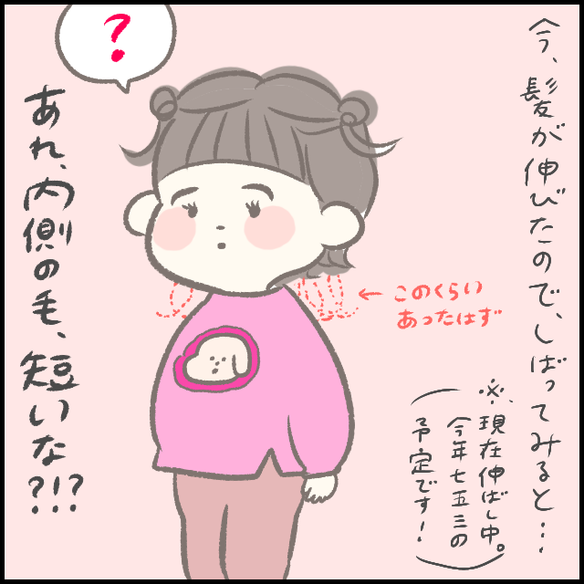 赤ちゃんのときはツーブロ風だった髪型は、おかっぱヘアーを経て、結べるほどの長さに成長したようです。お風呂で巻き髪に変身できるとは驚きです。しかし、内側はなぜか短いまま…!赤ちゃん時代のツーブロの名残りかもしれませんね(笑)。