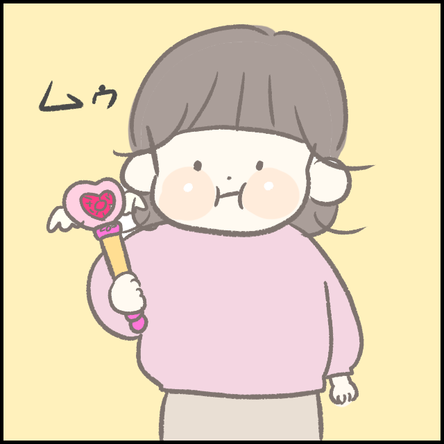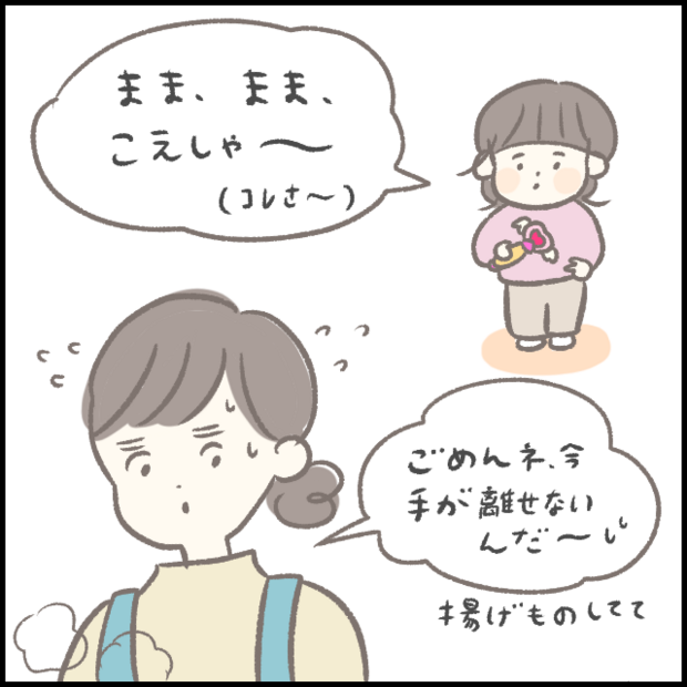 揚げもの中で手が離せないつぶみさん。ママがすぐに話をきいてくれないことを不満に思ったねむちゃんは、魔法のスティックを振りかざし…ポポイポーイ!ママを従わせるための呪文を唱えたのでした(笑)。