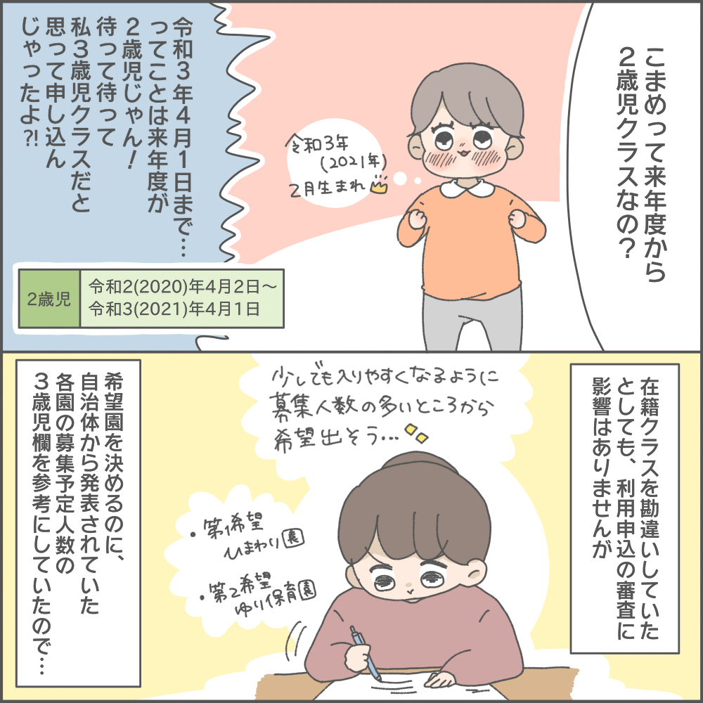 それは、娘の年齢児を間違えて申し込んでいたという失敗でした。入園申込みの書類に直接的な影響はないようですが、申込み希望園には大きな影響が…!第1希望にしていた園の3歳児枠は5人募集でしたが、2歳児枠ではたった1人だったようです。