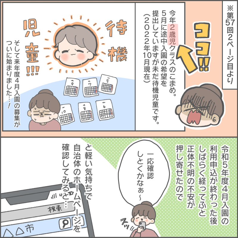 育児マンガ家おかめ(@omame_okame)さんの日常の出来事や奮闘をマンガでお届けします。昨年秋に、長女こまめちゃんの来年度保育園入園申し込みを無事終えたおかめさん。しかし、あとになってふと大きな間違いに気づいてしまったようです。その瞬間背筋がぞーっとなりました…