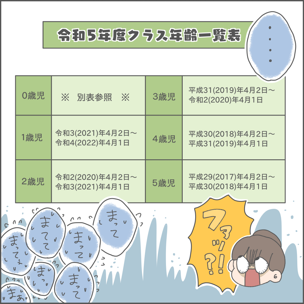 相当な激戦になることに気づいてしまったおかめさん、なんという失敗をしたものかと、背筋が凍り付いた瞬間でした。保育園は満年齢でクラス分けをしているため、間違いやすい点のひとつかもしれません。