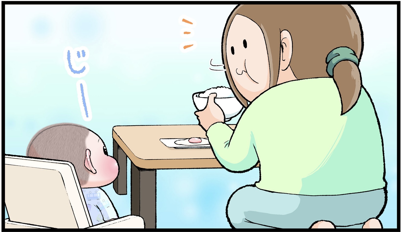 大人気にくきゅうぷにおさん(@nikukyupunio)の漫画をご紹介します。生後4ヶ月頃になると、お世話にも慣れてきて少しずつ生活のリズムが安定してきますが、まだまだ赤ちゃん最優先の毎日が続きますよね。さて、当時にくきゅうぷにおさんが食事をしていると、視線を感じることがあったそうですよ。視線の先にいるのはもちろん…?