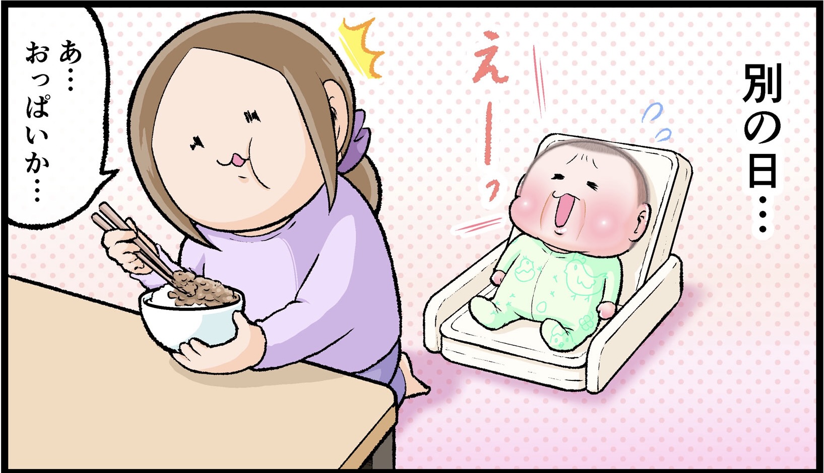赤ちゃんから目を離さないように目の前で食事をしていたにくきゅうぷにおさんでしたが、空腹な赤ちゃんにとっては飯テロになってしまったようですね。赤ちゃんの機嫌の変化に気がつき、急いで食事を終わらせようとする姿に共感するママも多いでしょう。