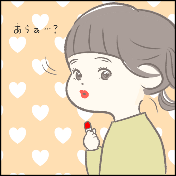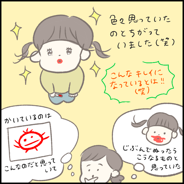 ねむちゃん(2歳)からクレヨンをあけてほしいと言われたつぶみさん。テーブルに向かって黙々とお絵描きを楽しんでいると思っていたら…振り返ったねむちゃんの顔には美しすぎる赤クレヨンのルージュが塗られていたのでした(笑)。
