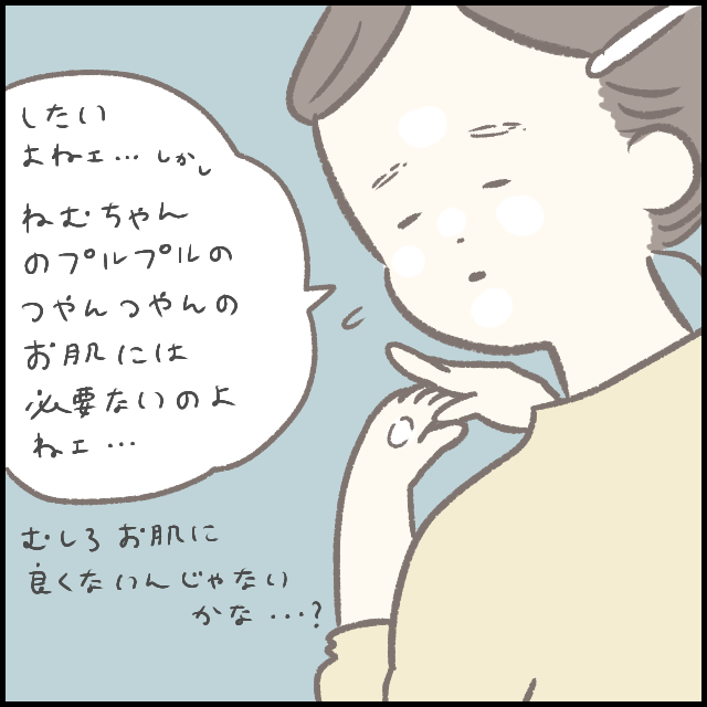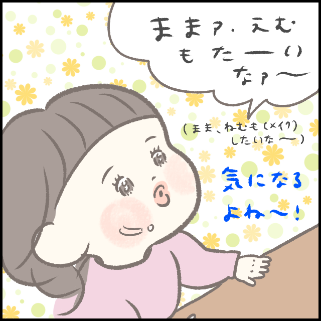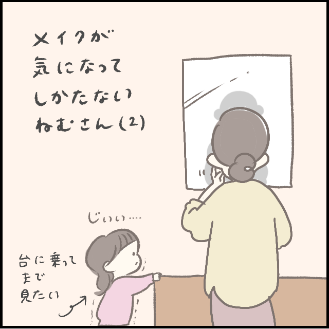 ママが鏡に向かって支度をする様子を台にのって観察するねむちゃん。まだお化粧する必要がないことを伝えるつぶみさんですが「ままみたいに!」の猛烈プッシュに嬉しくなってしまうのでした。