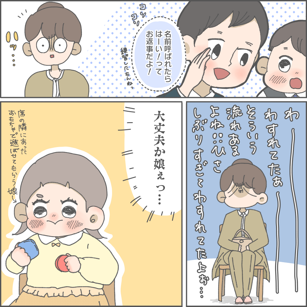 入園式で、名前を呼ばれたときにお返事ができるかなと心配になったおかめさんでしたが、しっかり手を挙げお返事をした娘の姿を目の当たりにし、なんだかホッとしました。お兄ちゃんのときに同様の行事は経験し流れを理解していても、時が経つとすっかり忘れてしまっているものですよね。
