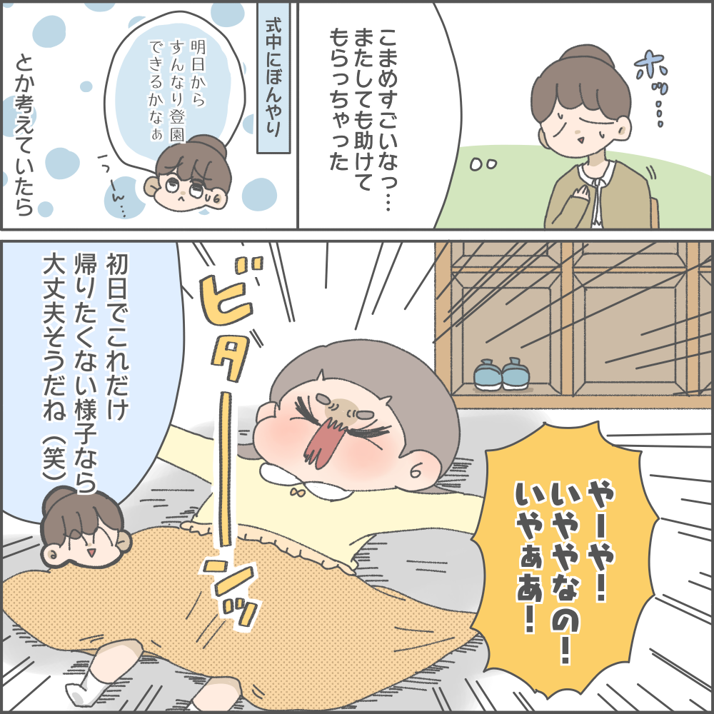 そして、「明日から園にすんなり行けるかしら…」と式中に考えていた親の心配をよそに、最後は意外にも帰りたくないモードになったこまめちゃん。これはかなり順調な保育園生活になりそうです…!