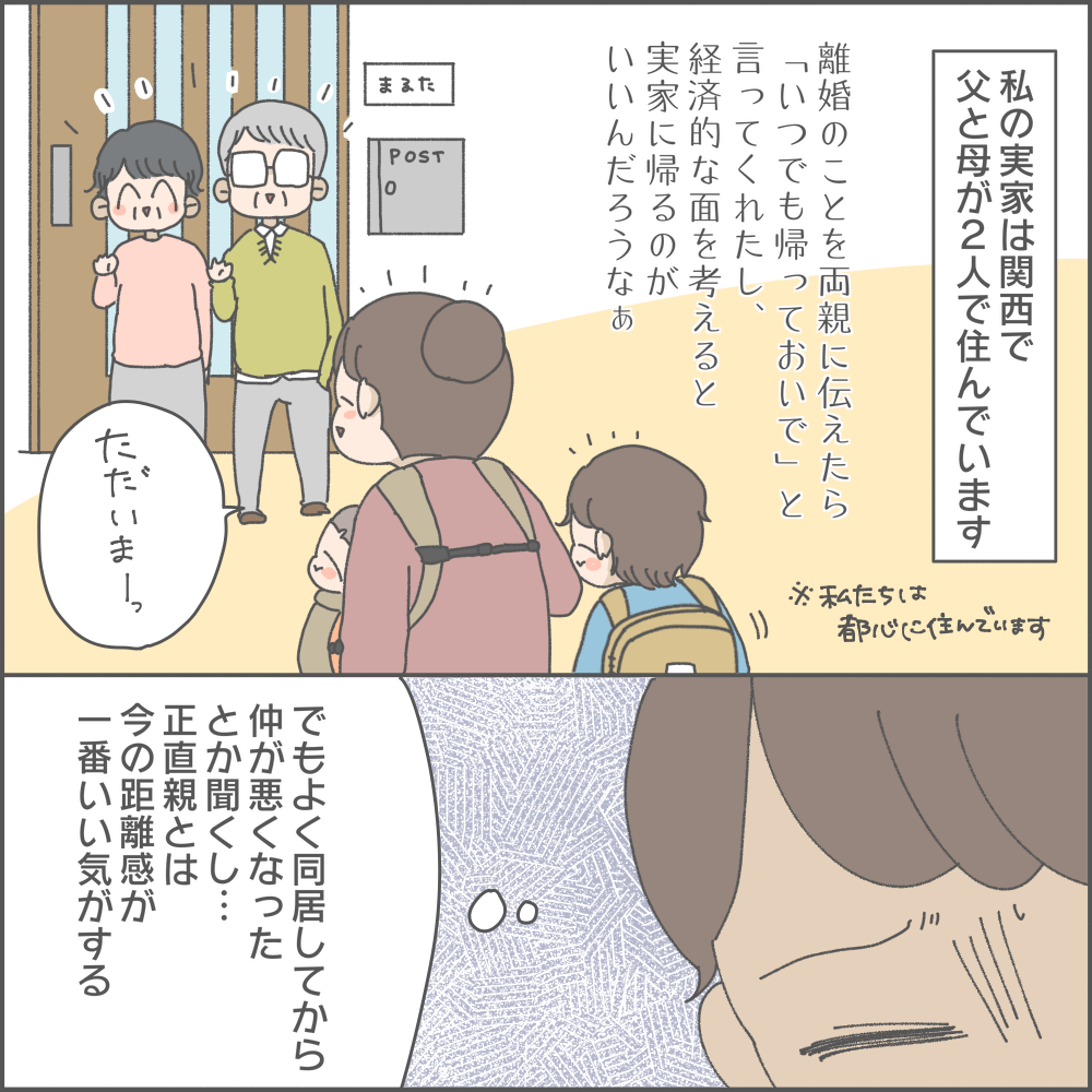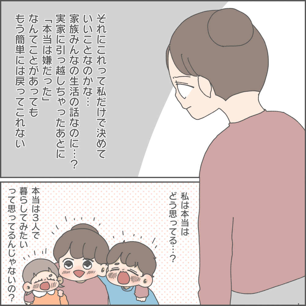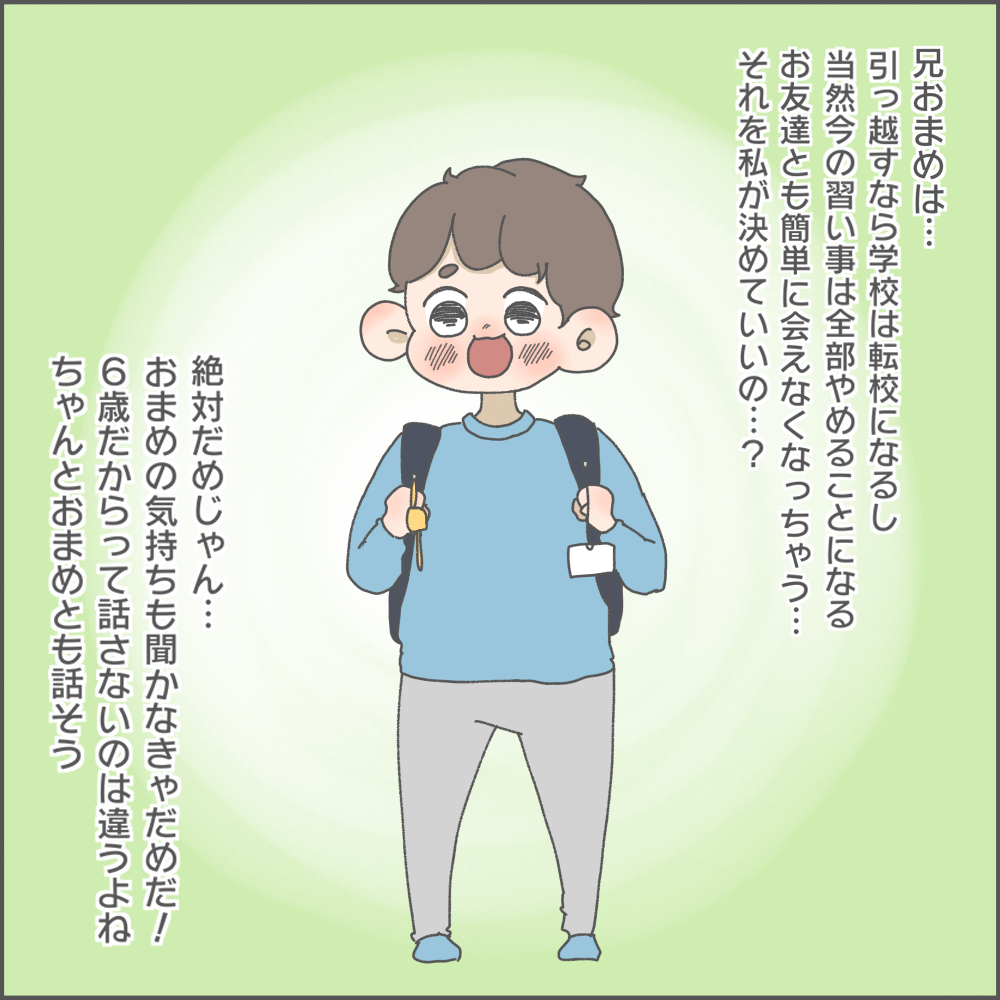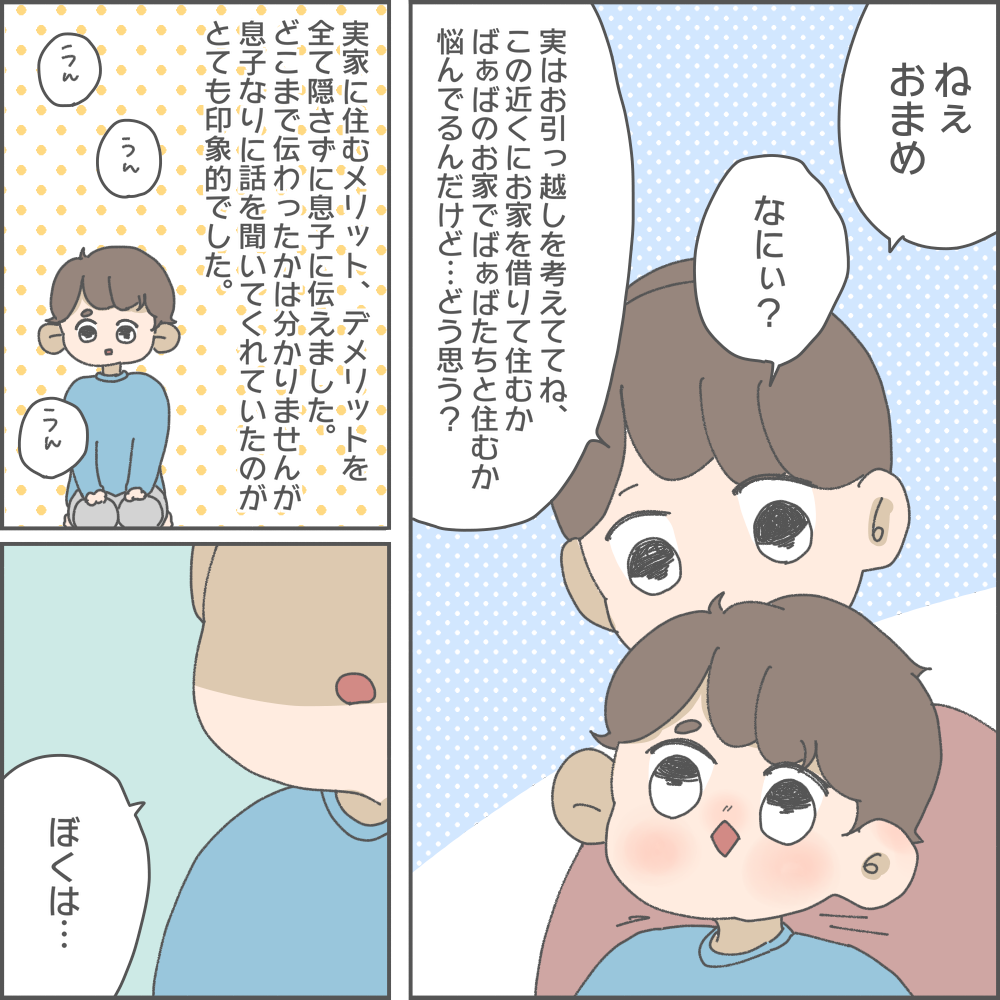 経済的な面などを考えると祖父母と一緒に住める大阪の実家が良いのかなと考えたおかめさん。しかし、ちょうどおまめくんの小学校入学を控えていたため、遠方に引っ越すことで息子に訪れる変化についてふと考えたようです。