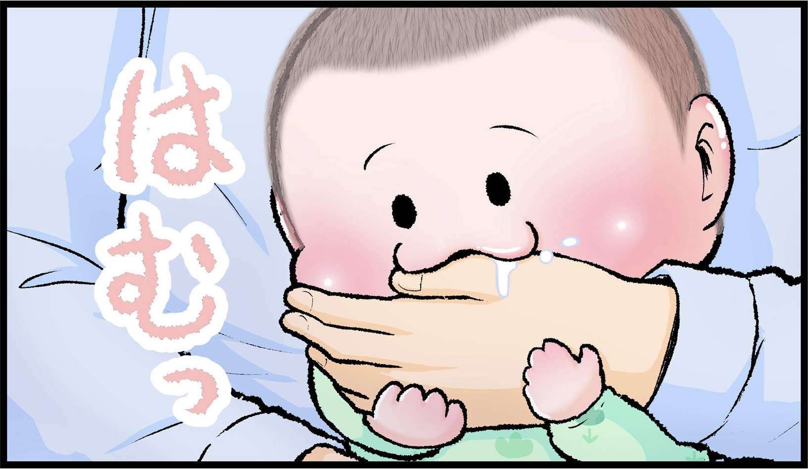 パパやママの手をつかんで「はむっ」と口に運ぶぷにおくん(当時4ヶ月)。まだ歯の生えていないお口でやさしくレロレロ攻撃をするだけでなく、想定外の力強い甘噛みでママを驚かすのでした(笑)。