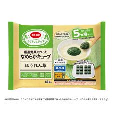 そんな不満を解決するのが、国産野菜で作ったなめらかキューブです。緑黄色野菜や根菜などの国産野菜ペーストをキューブ状にして、必要な量をいつでも使えるように冷凍にしています。ほうれんそうと水のみを使ったキューブや、8倍がゆのキューブもありますよ。