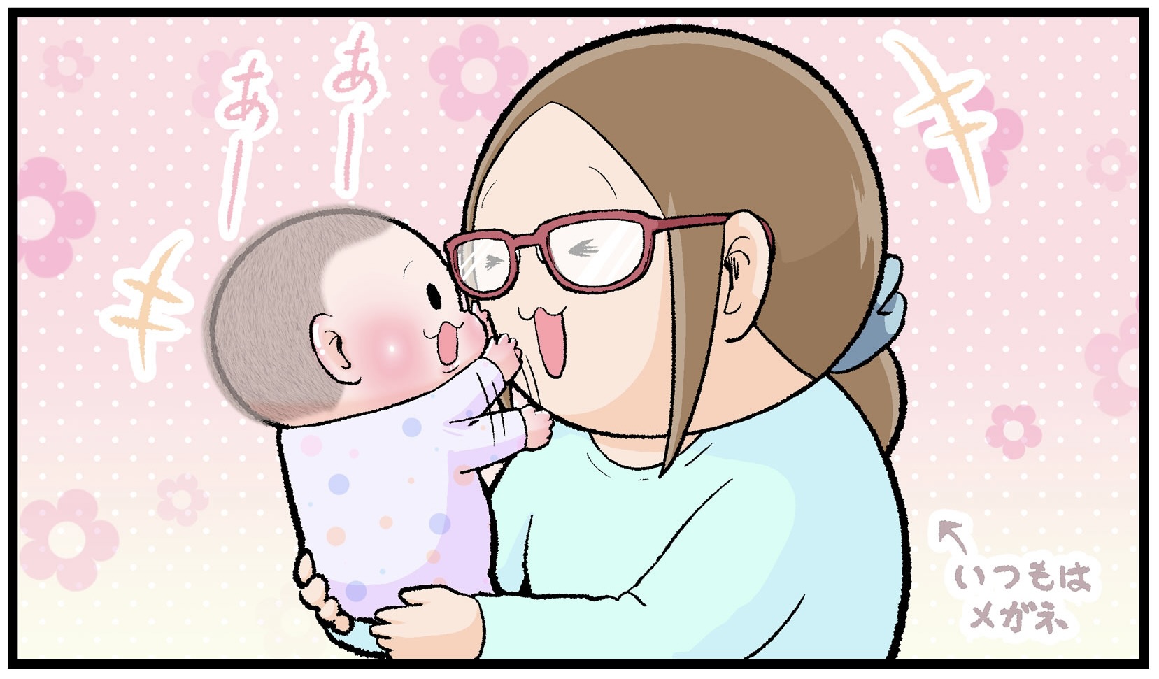 生後3ヶ月頃の赤ちゃんは首がすわりはじめ、手を使うことに興味がでてくる時期です。大好きなママの顔についているメガネに興味津々だったのかもしれません。