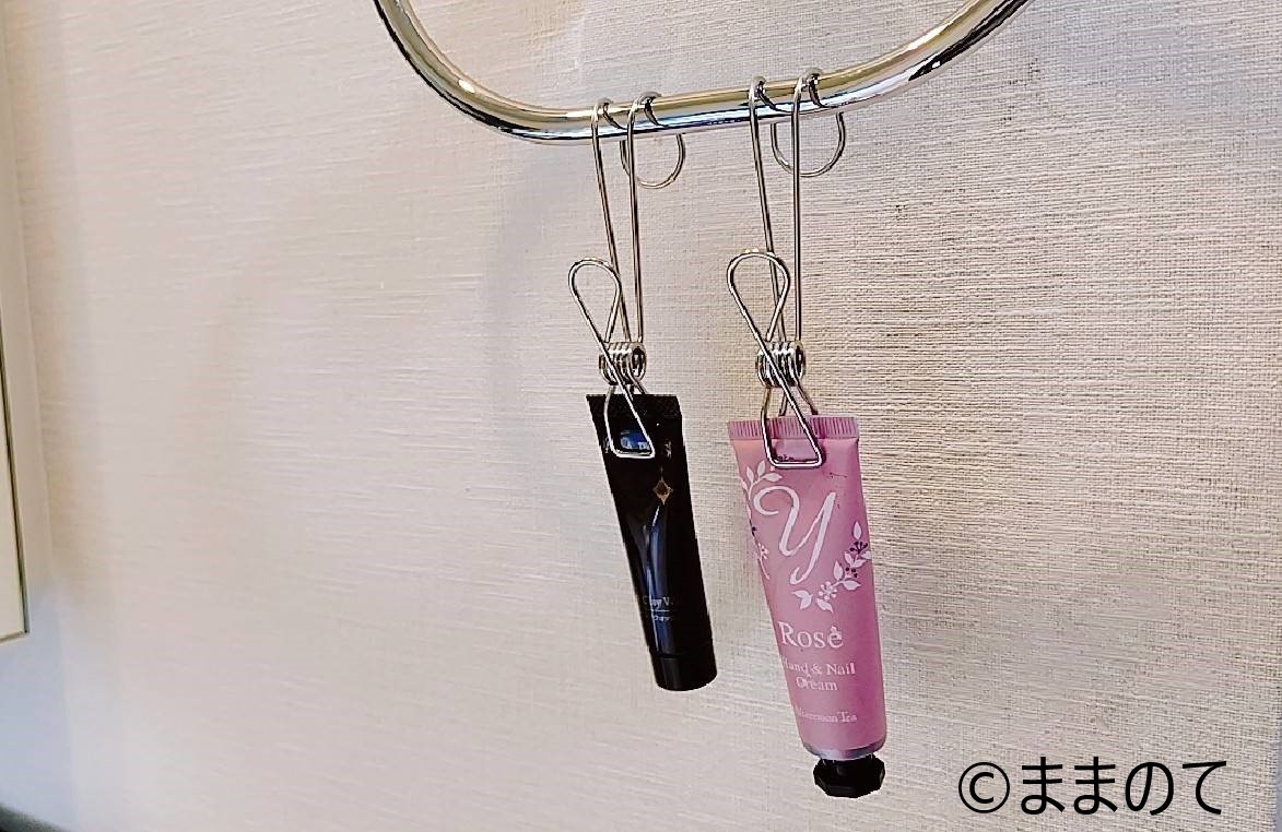 洗面所などのフックに引っ掛けることができる、ピンチを使った収納もおすすめです。置き場所に困るチューブタイプの歯磨き粉やハンドソープ、洗顔などをはさんでおいても良いでしょう。おしゃれに見せられるアイテムですよ。