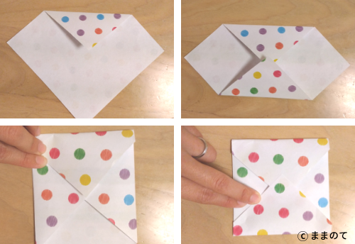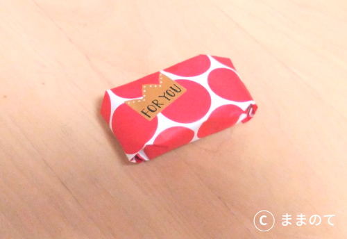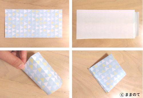 折り紙の真ん中に包みたいものを置き、折り紙を中央に向かって斜めに折っただけの簡単なラッピングです。折り紙の端の重なる部分をマスキングテープやシールでとめます。折り紙の柄とシールやマスキングテープをコーディネートするだけで、かわいいラッピングのでき上がりです。