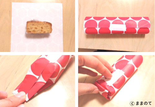 キャラメルを包むようにラッピングする、基本的なラッピング方法です。四角いものを包むのに向いています。包みたいものの大きさに合わせて折り紙をカットすると包みやすくなります。キャラメル包みはさまざまな包装に応用できるので、覚えておくと便利ですよ。