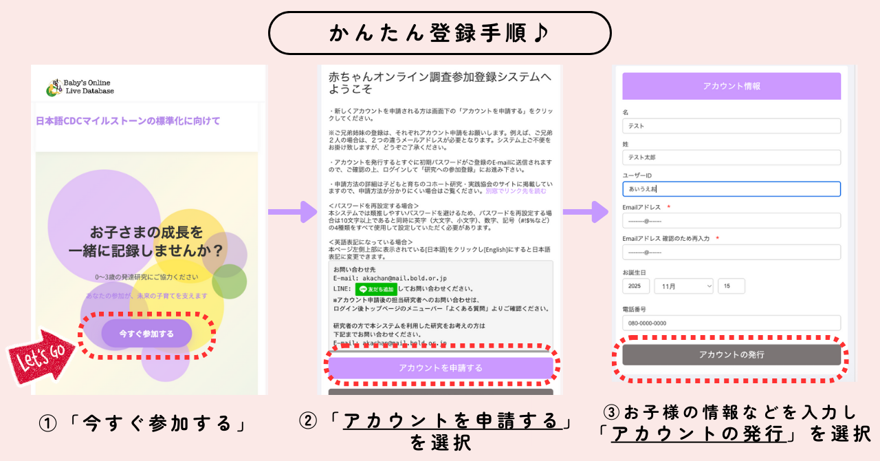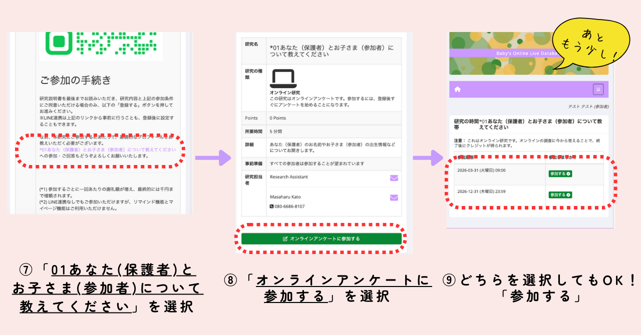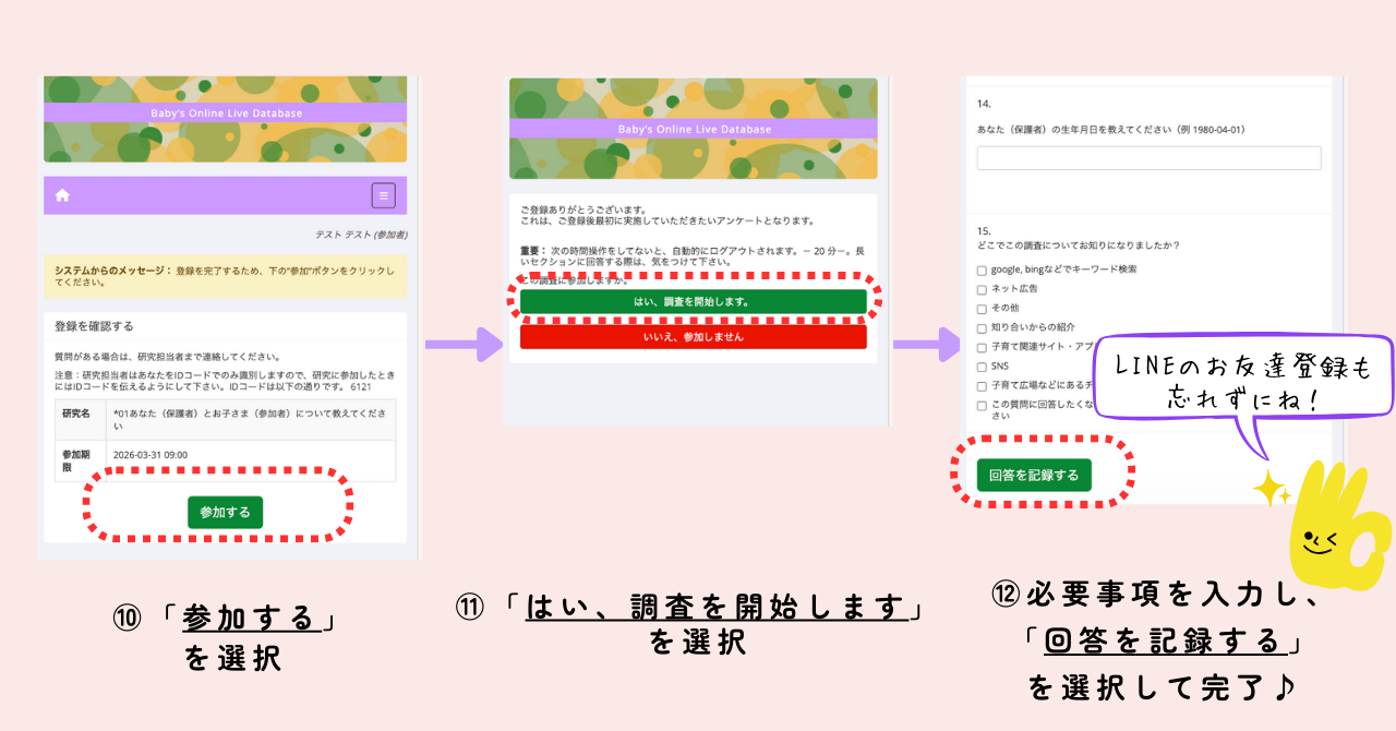 アンケート調査に参加いただくために、お子さまの情報などを事前に登録する必要があります。詳しい手順を画像で解説していますので、確認しながら進めてくださいね。またLINEのお友達登録も忘れずにお願いいたします。