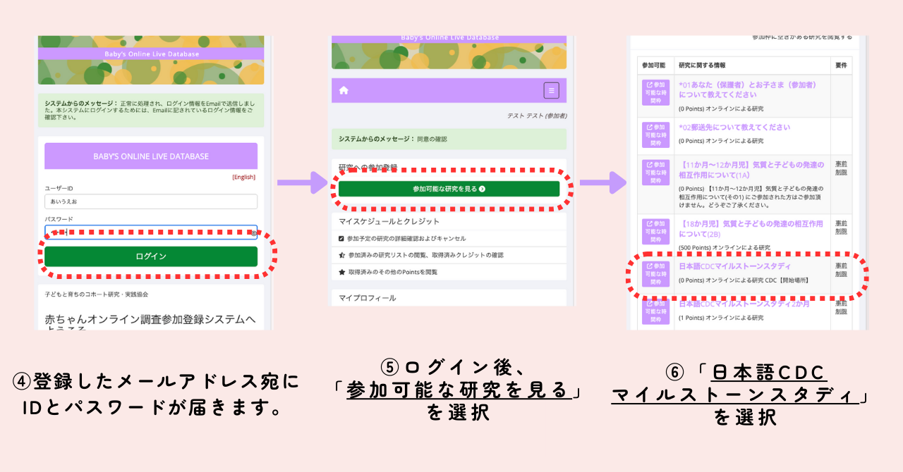 | ② 研究にエントリー | BOLDにログイン後、 「研究」から日本語CDCマイルストーンスタディ【開始場所】 を選択。 ※募集人数に達した場合、エントリーできないことがあります。 |