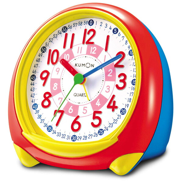 視覚効果を上手に利用した「くもん」の目覚まし時計です。短針・長針の色が違っていて、その針が示す同じ色の数字を読むと時刻がわかるようになっています。置き時計タイプの目覚まし機能付きなので、起床の時間設定はもちろん、食事や着替えなど時間までに準備をするシーンにも応用できます。目覚ましの音は、ピピピピッという電子音です。