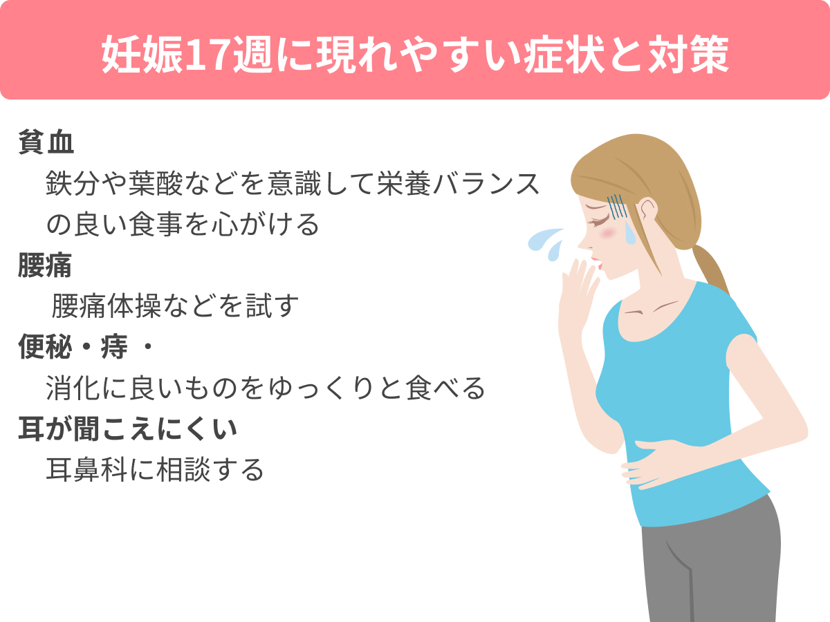 妊娠17週になると、ママの体内の血液量が増し、赤ちゃんに送る栄養が増えるため「鉄欠乏性貧血」と診断されることがあります。心臓に負担がかかるため、動悸や息切れといった症状が現れる人もいます。鉄分や葉酸が不足していると貧血になりやすいため、ママはバランス良く栄養を摂る必要があります。