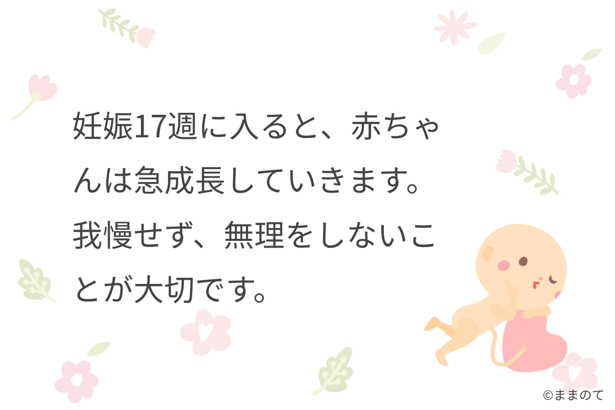 妊娠17週に入ると、赤ちゃんは急成長していきます。胎動を感じたり、ママの声に反応したり、ママとしての楽しみが増える時期でもありますね。お腹の赤ちゃんの成長とともにママのお腹も大きくなるので、マタニティウェアを検討しても良いでしょう。我慢せず、無理をしないことが大切です。
