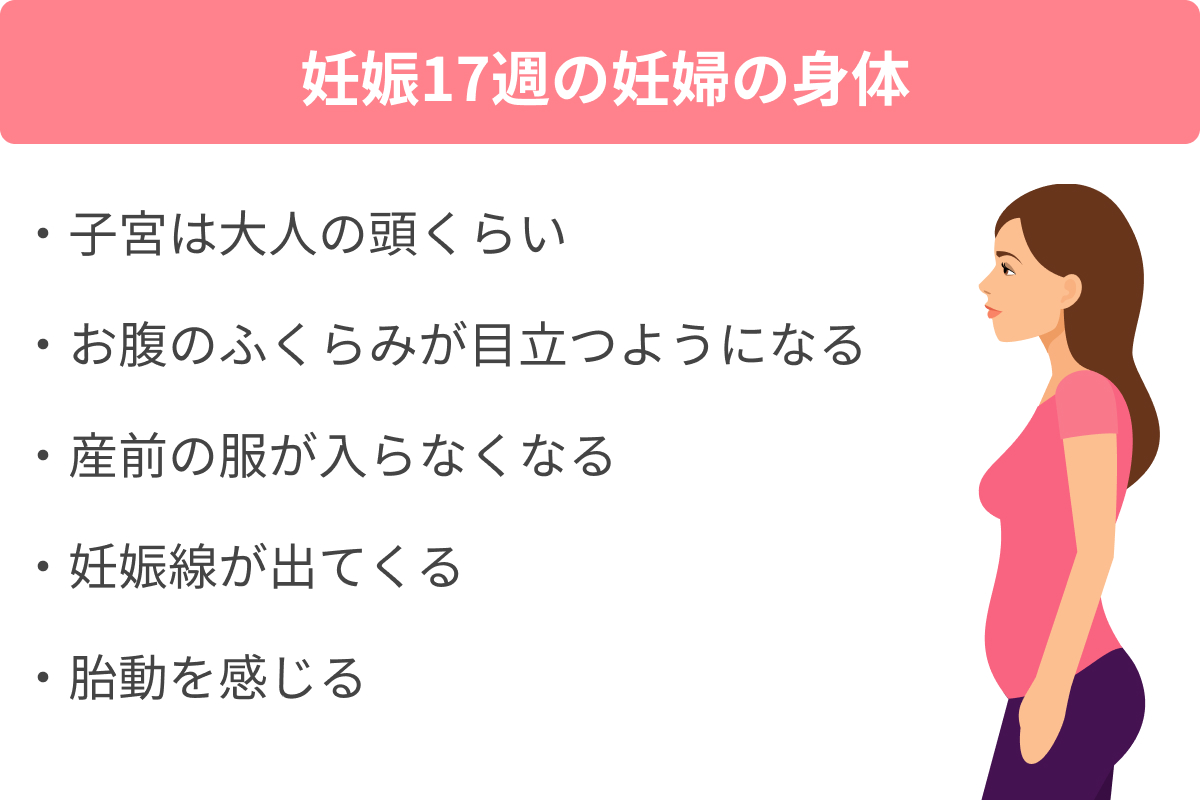 妊娠17週の子宮は大人の頭ぐらいの大きさです。妊娠前の子宮の大きさが鶏の卵程度だったことから比べると、ずいぶんと大きくなりましたね。「妊婦さん」と気づかれるほどお腹が目立つようになった人も少なくないでしょう。