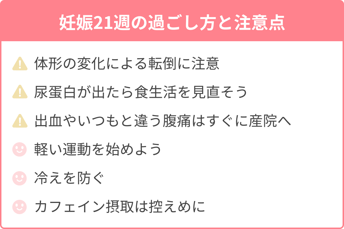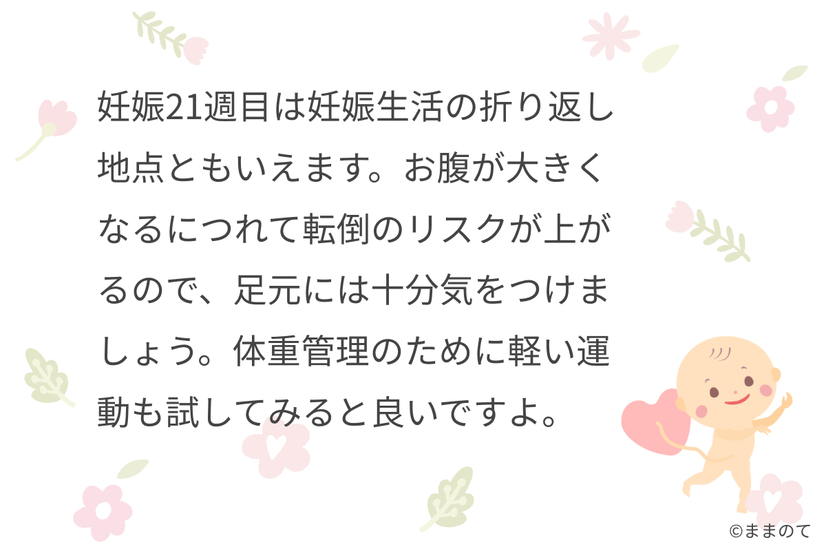 妊娠21週は妊娠生活の折り返し地点ともいえます。お腹が大きくなるにつれて転倒のリスクが上がるので、足元には十分気をつけましょう。体重管理のために軽い運動も試してみると良いですよ。健康的で安全なマタニティライフを送りたいですね。
