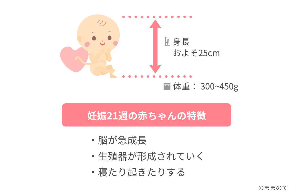 妊娠21週の赤ちゃんは、身長25cm、体重300g~450g程度の大きさに成長しています。脳の急成長が起こる時期で、聴覚も記憶力も発達しています。