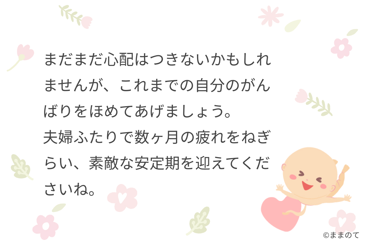 妊娠が判明してからの急激な変化はママだけではなく、パパも感じています。ママの気持ちをわかってくれない場面があったとしても、パパはどうして良いかわからず戸惑っていたのかもしれません。夫婦ふたりで数ヶ月の疲れをねぎらい、素敵な安定期を迎えてくださいね。