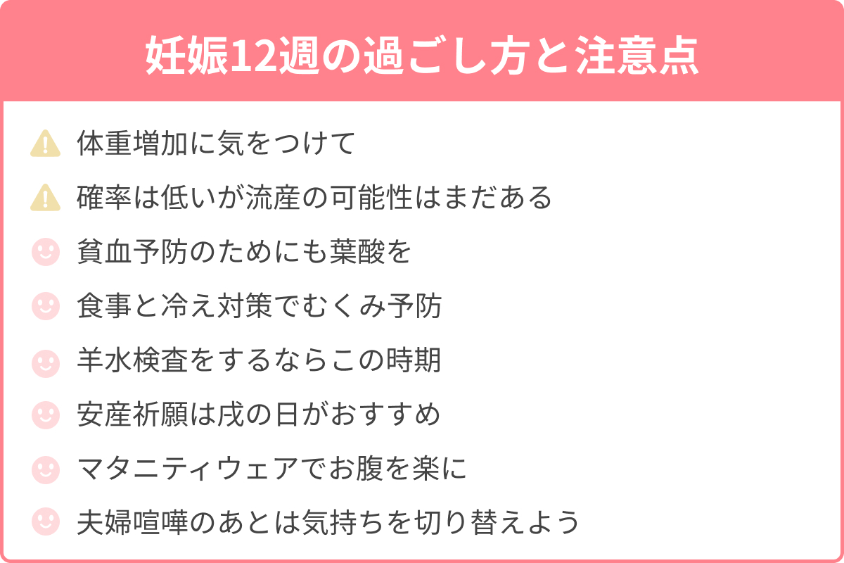 | つわり | ・気にしすぎないでリラックスして過ごす ・症状が強いときは医師に相談する |
