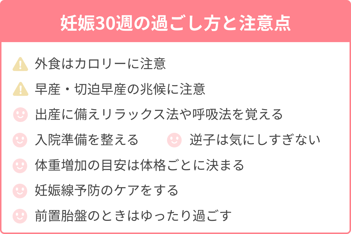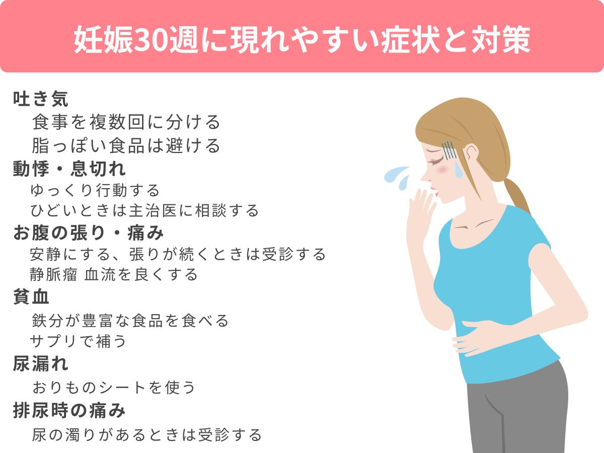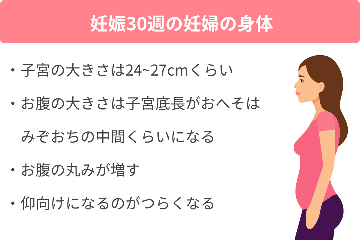 【医師監修】妊娠30週(30w)は、妊娠8ヶ月の3週目です。妊娠後期の赤ちゃんの体重は平均で1000gを超えるようになり、お腹はますます大きくなってきます。子宮に胃や血管が圧迫され、吐き気、静脈瘤、尿漏れなどに悩まされる時期です。赤ちゃんの平均的な発育や胎動の様子、ママが気を付けたい症状や生活の注意点などを解説します。