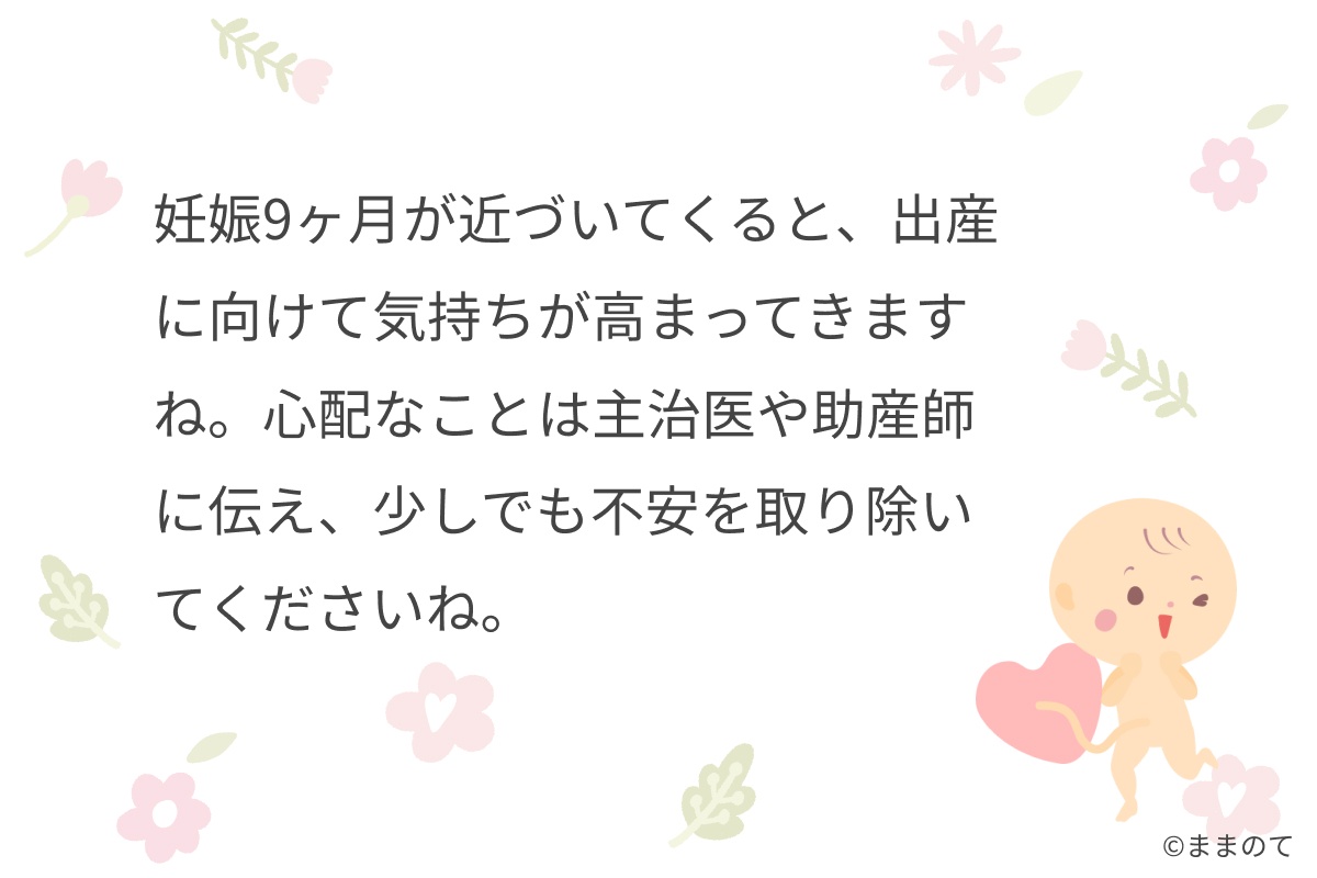 妊娠週数が進み妊娠9~10ヶ月になると、里帰りするママや産休に入るママは生活が大きく変わります。出産が近づき、気持ちが落ち着かないことが増えてくるかもしれません。妊娠の経過によっては、安静にするよう指示を受けたり入院する必要がでてきたりすることもあります。