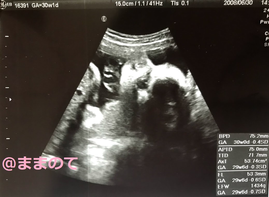 妊娠30週1日のエコー画像です。体重1,434g、BPD7.5cmに成長しています。エコー画像には全身が入りきらず、頭部から胸にかけてが写し出されています。横顔から、頭の丸み、目、鼻が確認できますね。