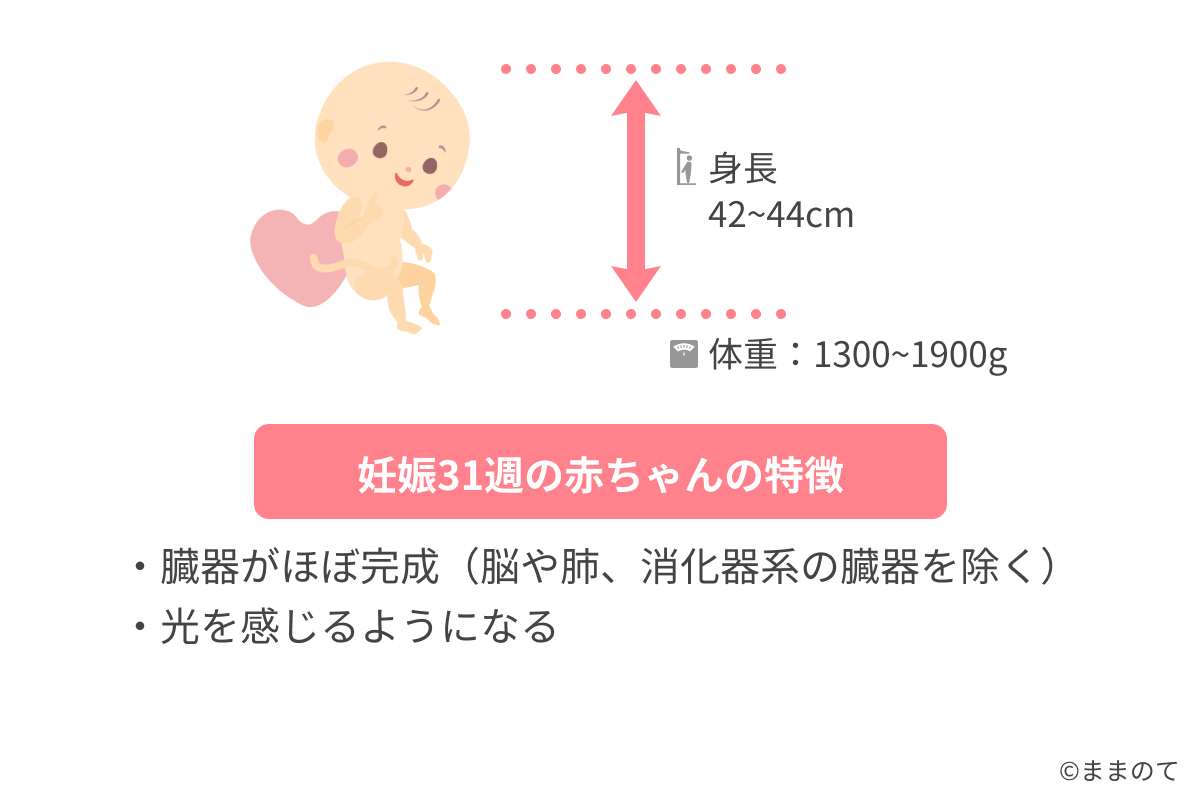 妊娠31週(31w)の胎児の体重の平均は1,500g、身長の平均は43cmです。骨格は産まれたての赤ちゃんとほぼ変わらない形にまで成長し、脳や肺、消化器系の臓器以外はほぼ完成しています。31週頃になると赤ちゃんの身体が大きく成長して子宮いっぱいになってきます。また、激しい胎動を感じることがあります。
