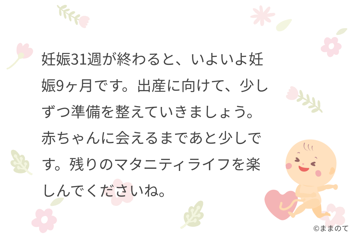 妊娠31週が終わると、いよいよ妊娠9ヶ月です。出産に向けて、少しずつ準備を整えていきましょう。赤ちゃんに会えるまであと少しです。残りのマタニティライフを楽しんでくださいね。