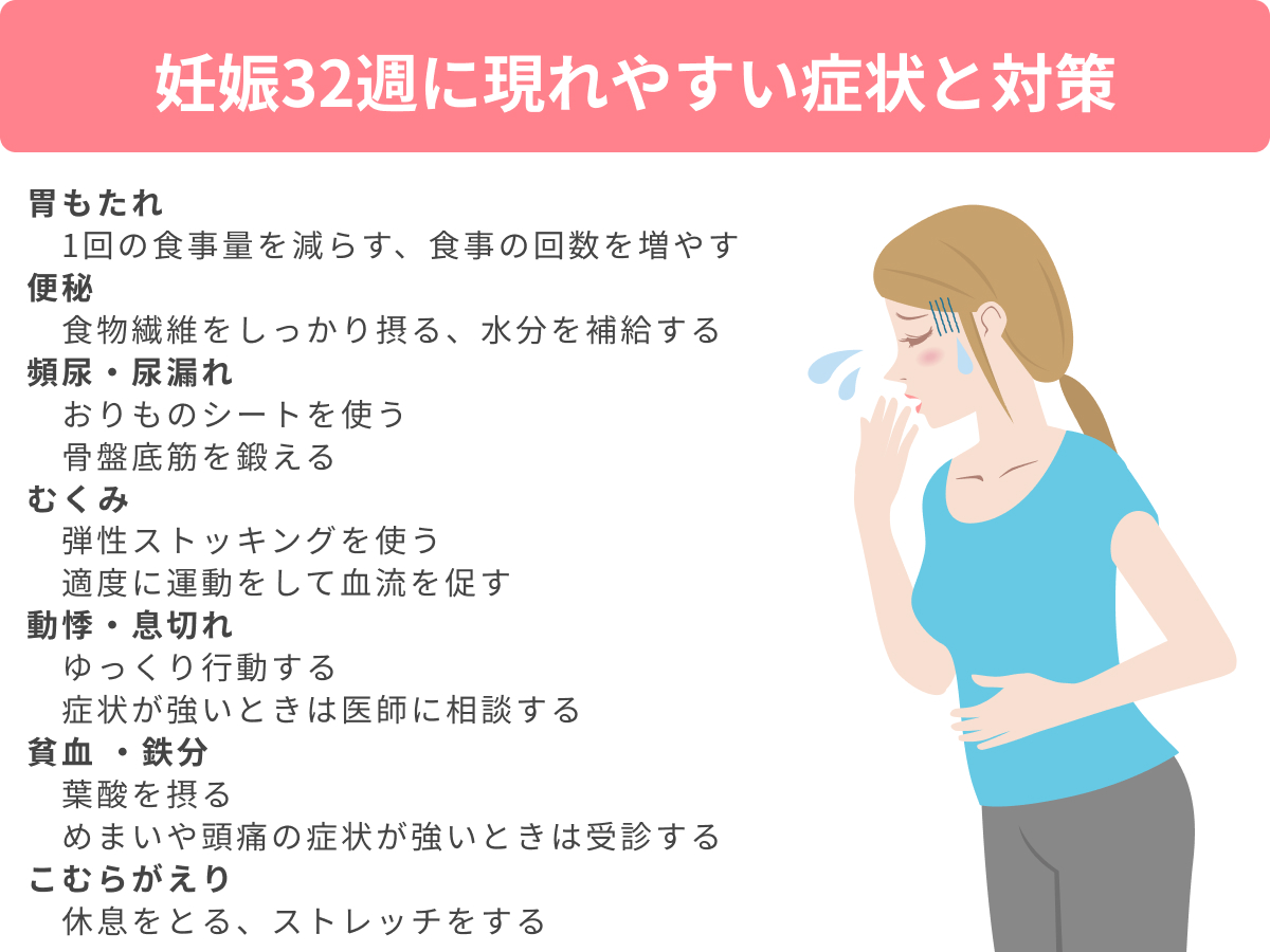 妊娠32週にあらわれやすい症状 胃もたれ、便秘、むくみ…