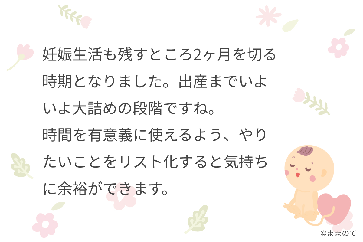 妊娠生活も残すところ2ヶ月を切る時期となりました。出産までいよいよ大詰めの段階ですね。赤ちゃんを迎えるために、物心両面で準備を進めていることでしょう。時間を有意義に使えるよう、やりたいことをリスト化すると気持ちに余裕ができます。
