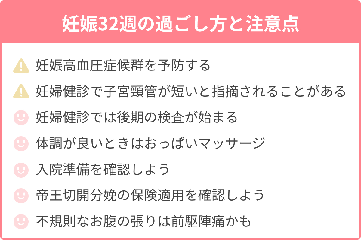 【医師監修】妊娠32週(32w)は妊娠9ヶ月の第1週です。妊娠後期も中盤に差しかかり、いよいよ出産予定日が近づいてきます。赤ちゃんは新生児とほぼ変わらない姿に成長しています。胎児の大きさと体重について解説。お腹の張りや前駆陣痛、切迫早産などお産の進行につながる症状、逆子の治し方、過ごし方の注意点も見ていきましょう。