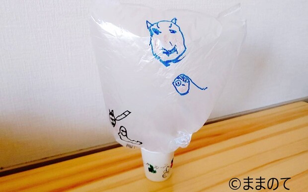 5.紙コップの上部分にすきまができないよう、ビニール袋を取り付け、セロハンテープで固定する