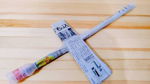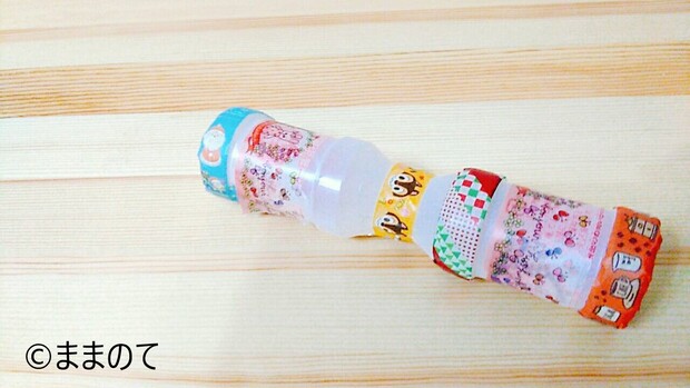 1.ペットボトルをきれいに洗い、好きな電車の柄の折り紙を巻く(もしくはフェルトなどの布でくるむ)