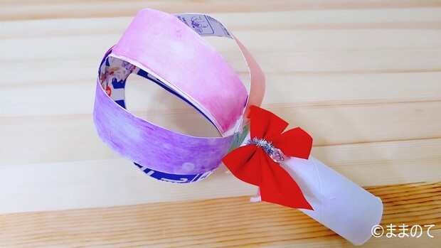 3.お面に帯をつけて、後ろに輪ゴムをつけて完成