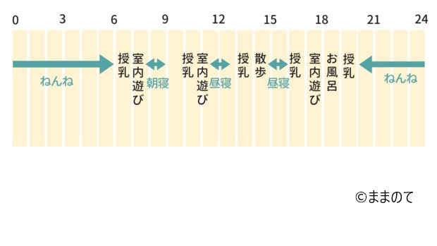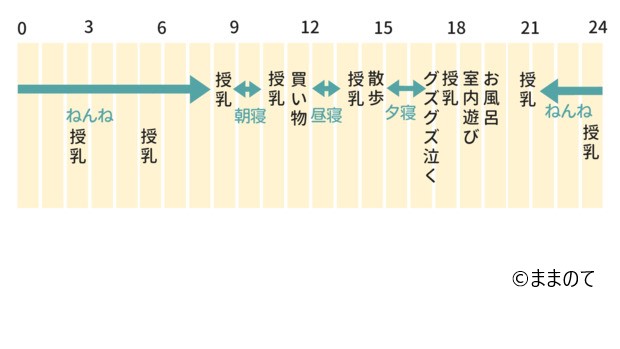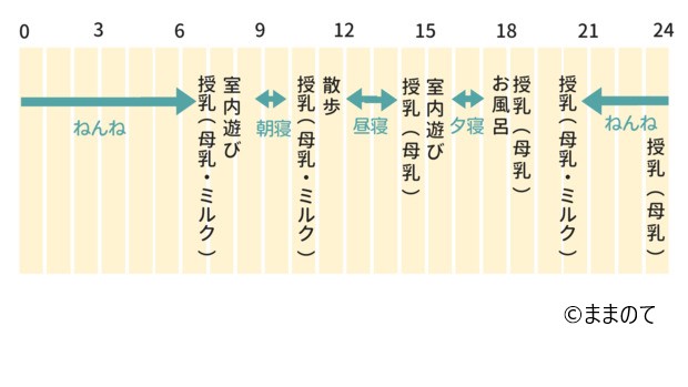 完全母乳母、混合、完全ミルクの場合のスケジュール例を見てみましょう。あくまで見本なので、スケジュールの通りにいかないこともありますが、参考にしてみてくださいね。