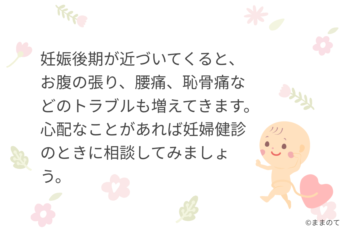 妊娠後期が近づいてくると、お腹の張り、腰痛、恥骨痛などのトラブルも増えてきます。心配なことがあれば妊婦健診のときに相談してみましょう。気になったことを忘れないようにメモしておくと、診察がスムーズですよ。